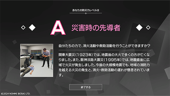 さらに、体験終了時にプレイヤーの防災力レベルを判定することも可能だ。